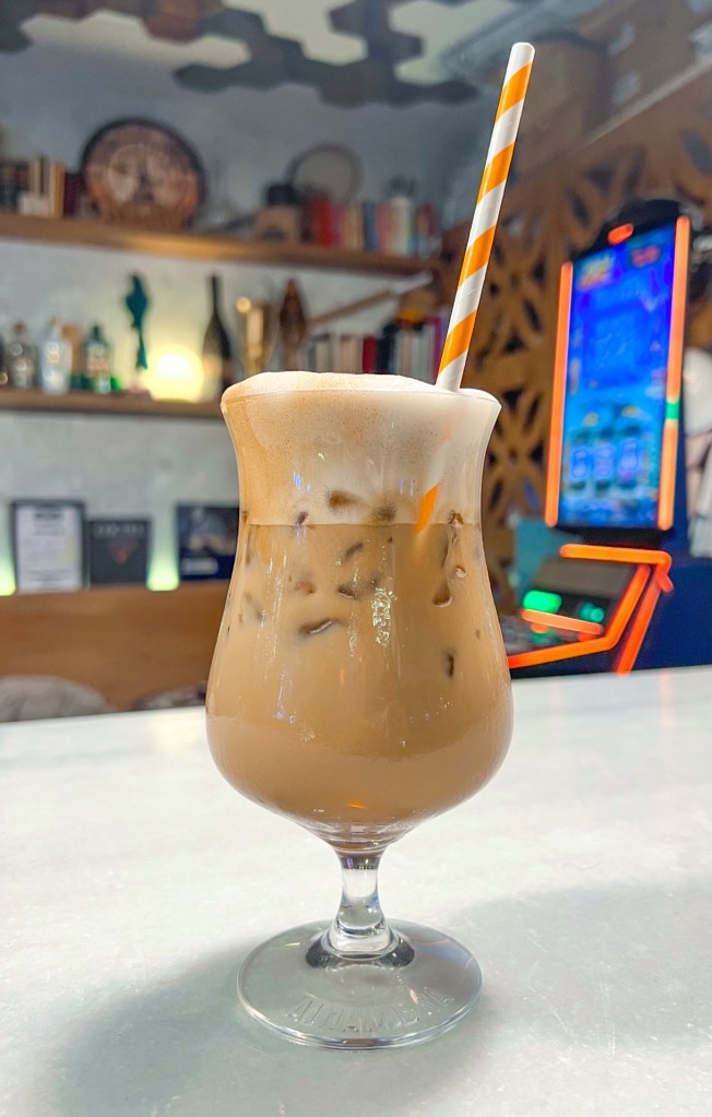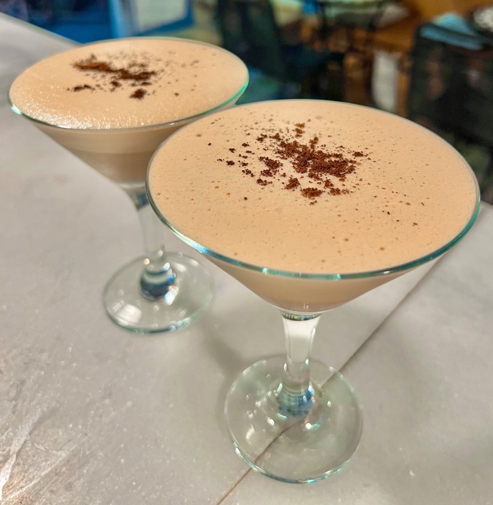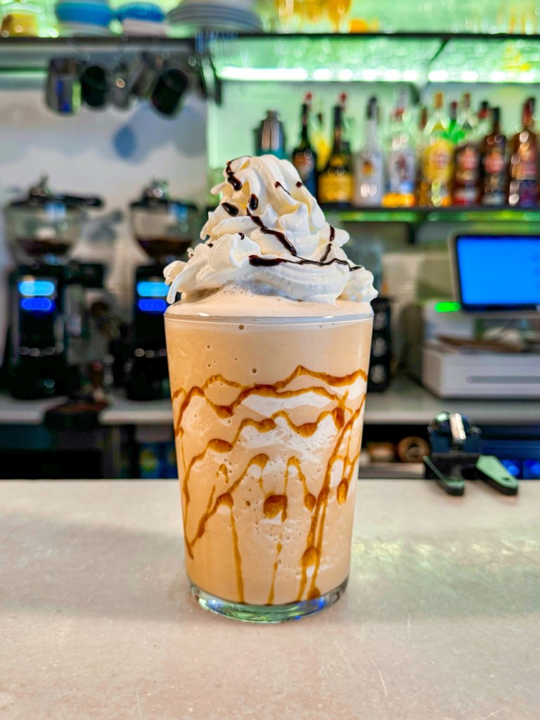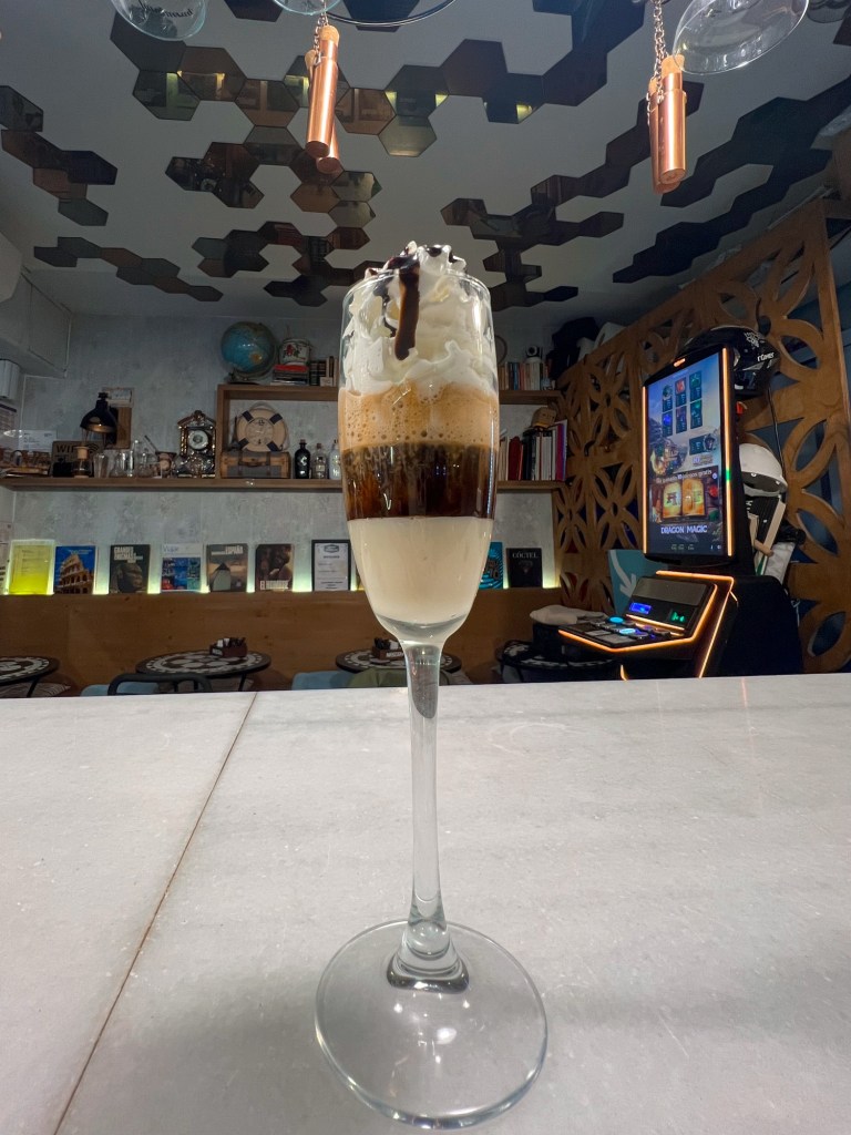 Espresso doble y leche montada. Podemos agregarle cacao espolvoreado y chocolate.
